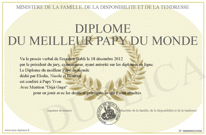 Envoyez par email votre Diplôme du meilleur Papy du monde personalisé