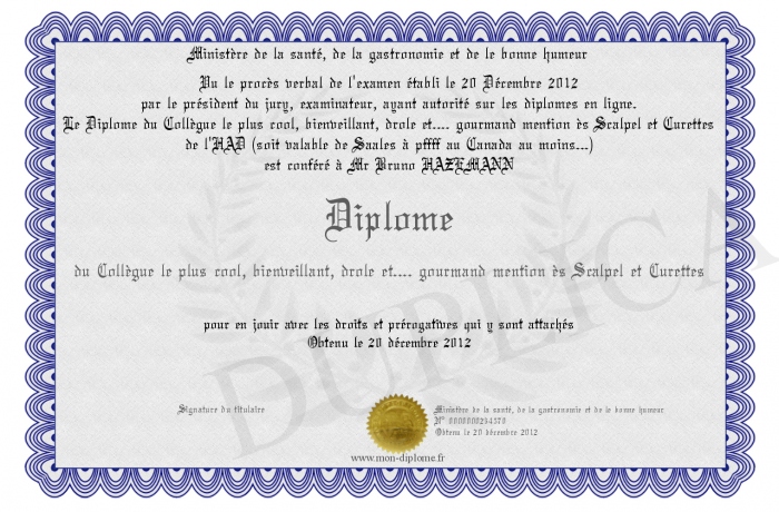 Envoyez par email votre Diplôme du Collègue le plus cool, bienveillant, drôle et.... gourmand mention ès Scalpel et Curettes personalisé