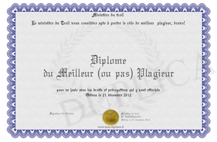 Envoyez par email votre Diplôme du Meilleur (ou pas) Plagieur personalisé