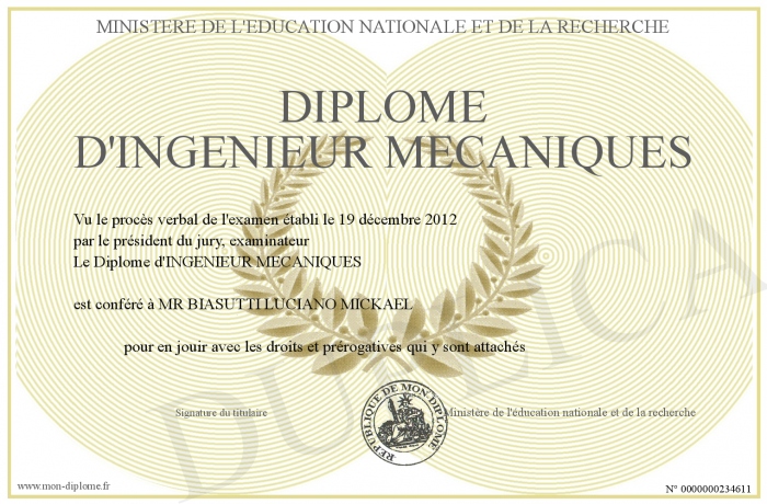 Envoyez par email votre Diplôme d'INGENIEUR MECANIQUES personalisé