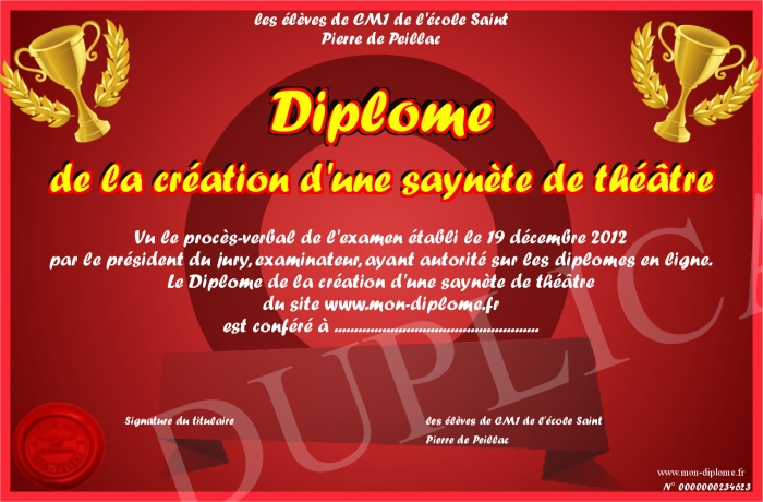 Envoyez par email votre Diplôme de la création d'une saynète de théâtre personalisé