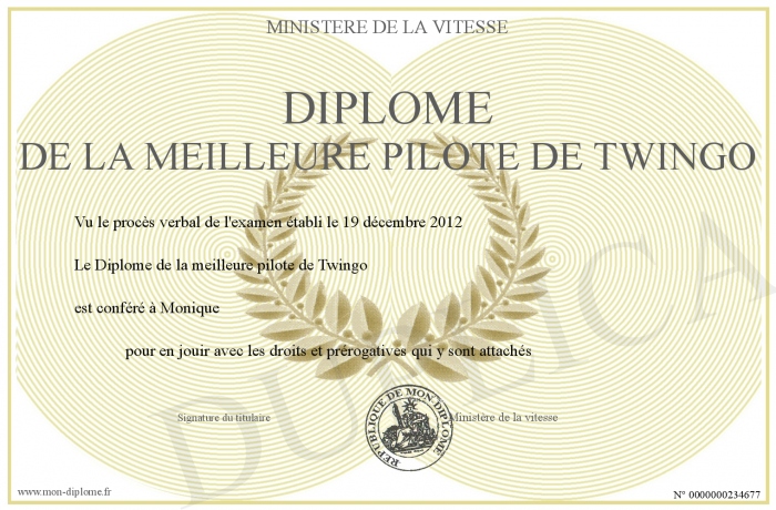 Envoyez par email votre Diplôme de la meilleure pilote de Twingo personalisé