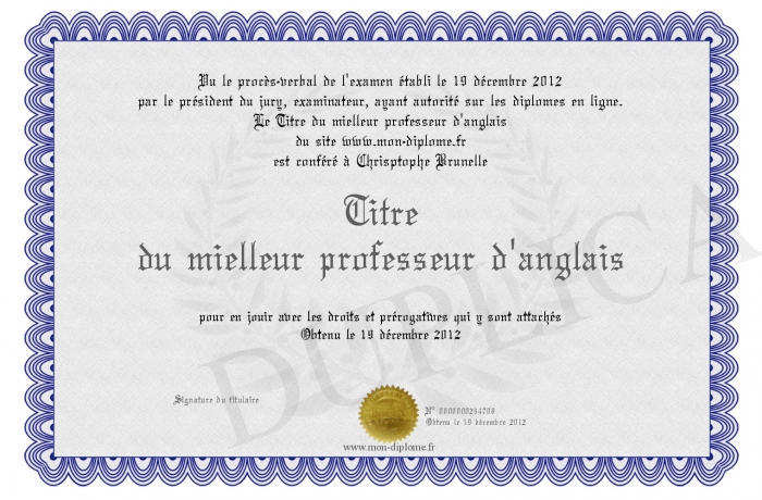 Envoyez par email votre Titre du mielleur professeur d'anglais personalisé