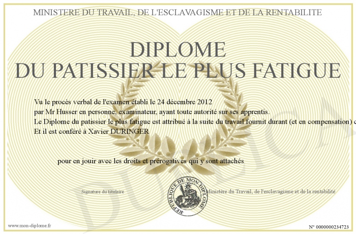 Envoyez par email votre Diplome du patissier le plus fatigue personalisé