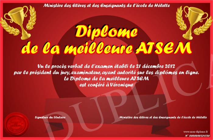 Envoyez par email votre Diplôme de la meilleure ATSEM personalisé