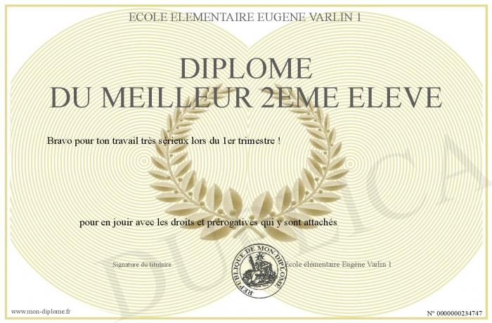 Envoyez par email votre Diplôme du meilleur 2ème élève personalisé