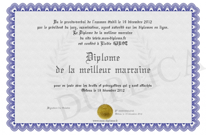 Envoyez par email votre Diplôme de la meilleur marraine personalisé