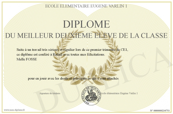 Envoyez par email votre Diplôme du meilleur deuxième élève de la classe personalisé