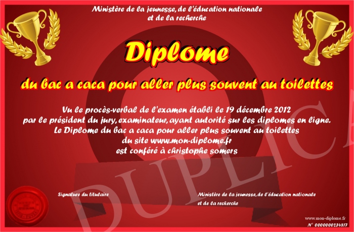Envoyez par email votre Diplôme du bac a caca pour aller plus souvent au toilettes personalisé
