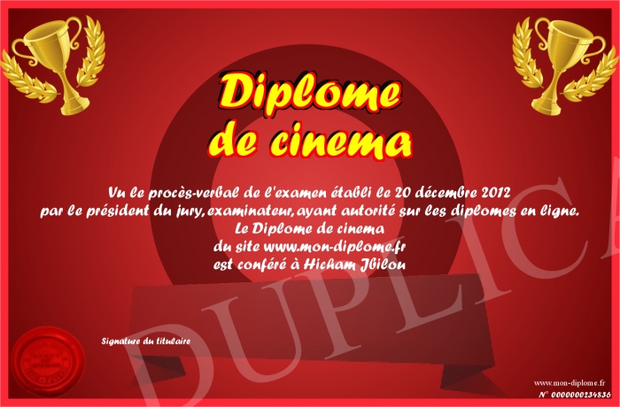 Envoyez par email votre Diplôme de cinema personalisé