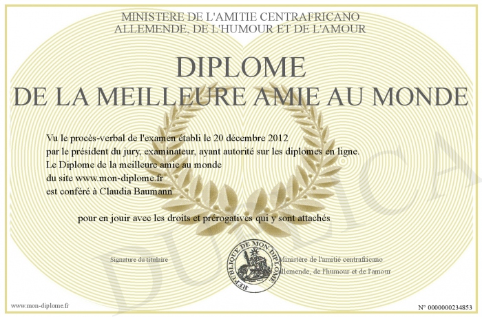 Envoyez par email votre Diplôme de la meilleure amie au monde personalisé