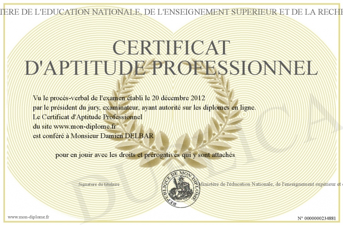 Envoyez par email votre Certificat d'Aptitude Professionnel personalisé