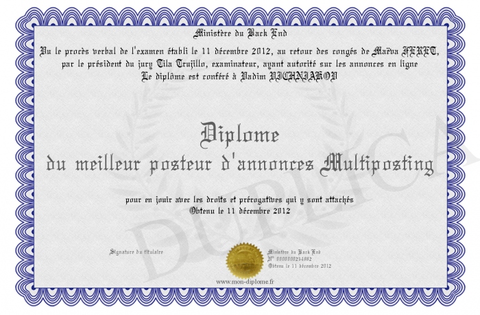 Envoyez par email votre Diplôme du meilleur posteur d'annonces Multiposting personalisé