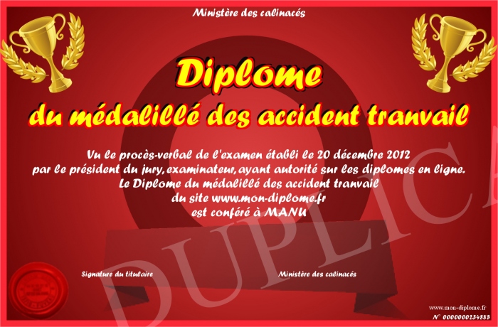 Envoyez par email votre Diplôme du médalillé des accident tranvail personalisé