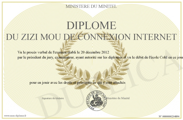 Envoyez par email votre Diplôme du Zizi Mou de connexion internet personalisé