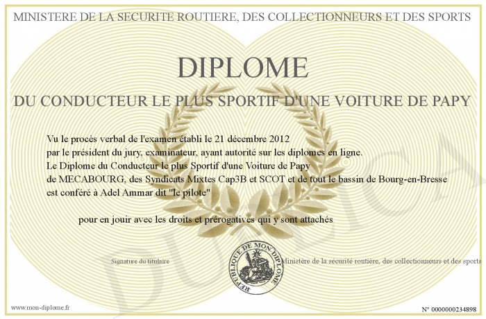 Envoyez par email votre Diplôme du Conducteur le plus Sportif d'une Voiture de Papy personalisé