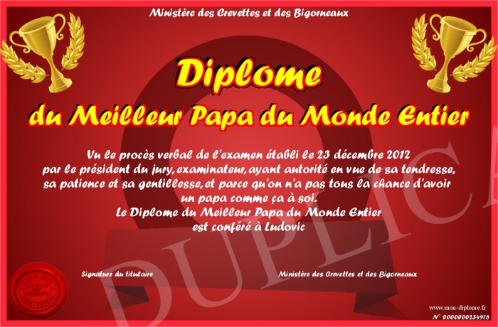 Envoyez par email votre Diplôme du Meilleur Papa du Monde Entier personalisé