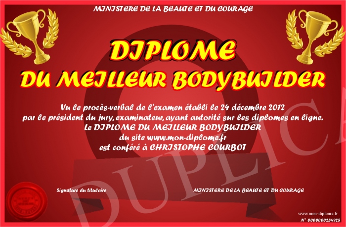 Envoyez par email votre DIPLOME DU MEILLEUR BODYBUILDER personalisé