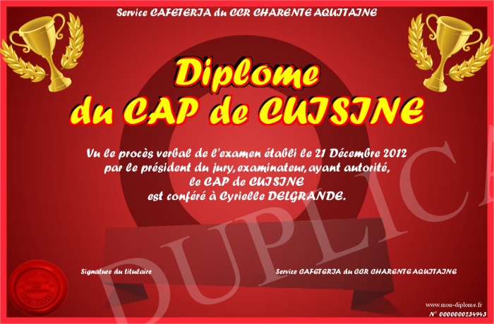 Envoyez par email votre Diplôme du CAP de CUISINE personalisé