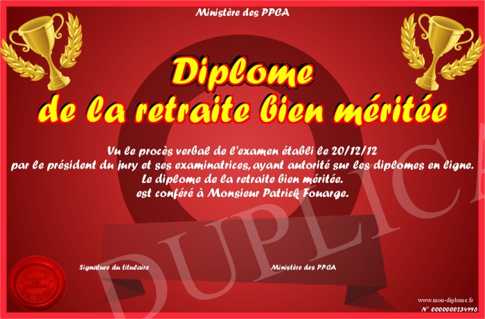 Envoyez par email votre Diplôme de la retraite bien méritée personalisé