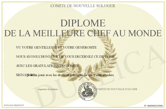 Envoyez par email votre Diplôme de la meilleure chef au monde personalisé