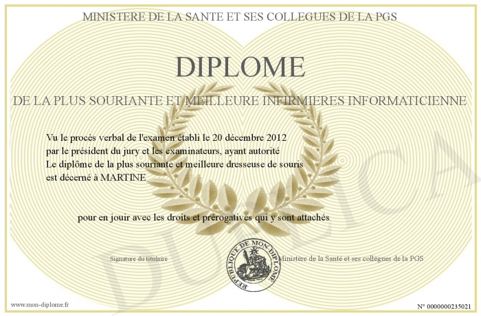 Envoyez par email votre Diplôme de la plus souriante et meilleure infirmières informaticienne personalisé
