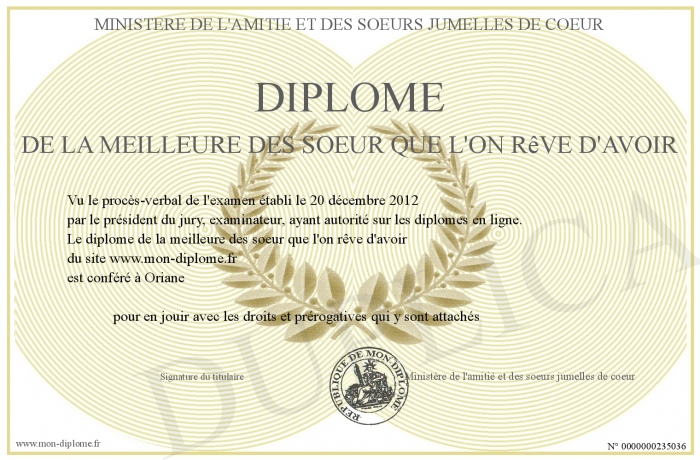 Envoyez par email votre diplôme de la meilleure des soeur que l'on rêve d'avoir personalisé