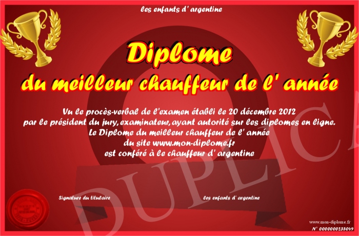 Envoyez par email votre Diplôme du meilleur chauffeur de l' année personalisé