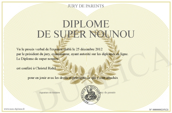 Envoyez par email votre Diplôme de super nounou personalisé