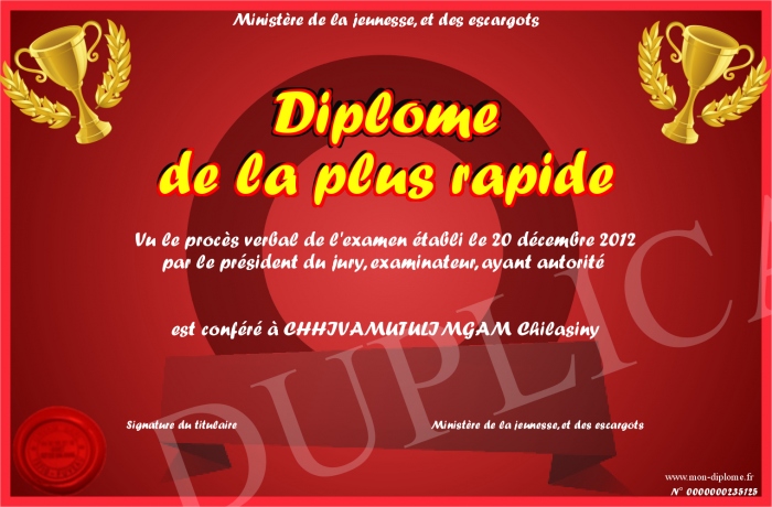 Envoyez par email votre Diplôme de la plus rapide personalisé