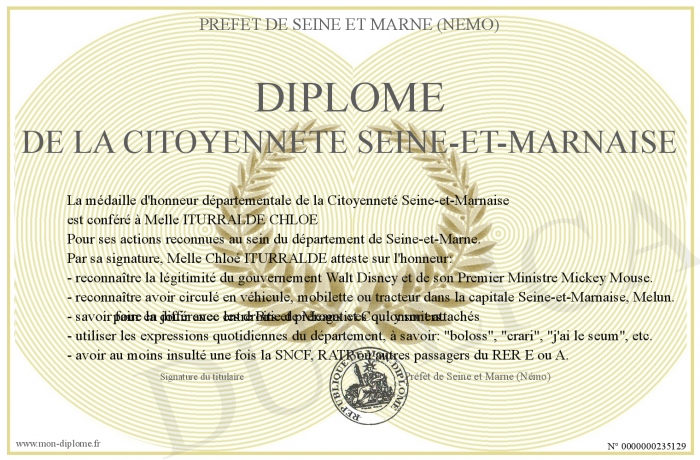 Envoyez par email votre Diplôme de la Citoyenneté Seine-et-Marnaise personalisé