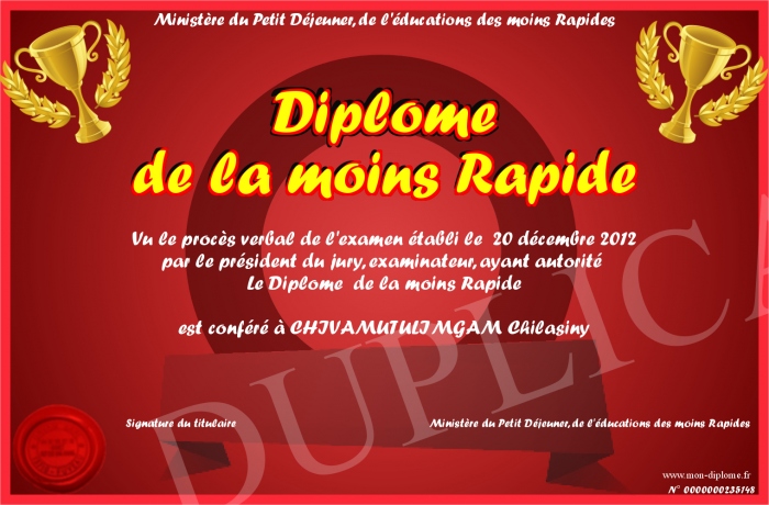 Envoyez par email votre Diplôme de la moins Rapide personalisé