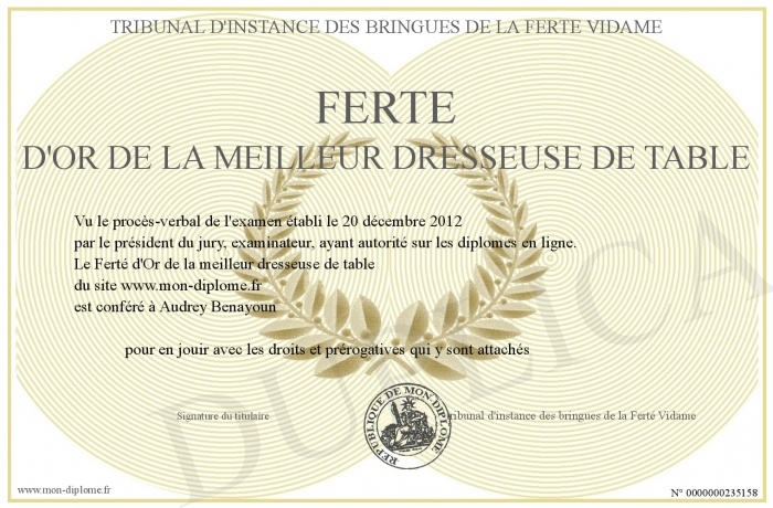 Envoyez par email votre Ferté d'Or de la meilleur dresseuse de table personalisé