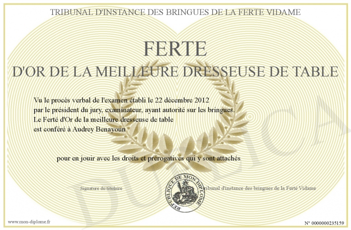 Envoyez par email votre Ferté d'Or de la meilleure dresseuse de table personalisé