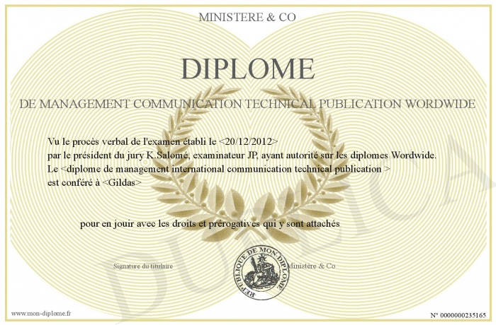 Envoyez par email votre diplome de management communication technical publication wordwide personalisé