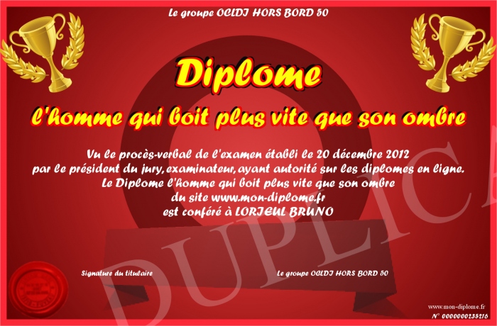 Envoyez par email votre Diplome l'homme qui boit plus vite que son ombre personalisé