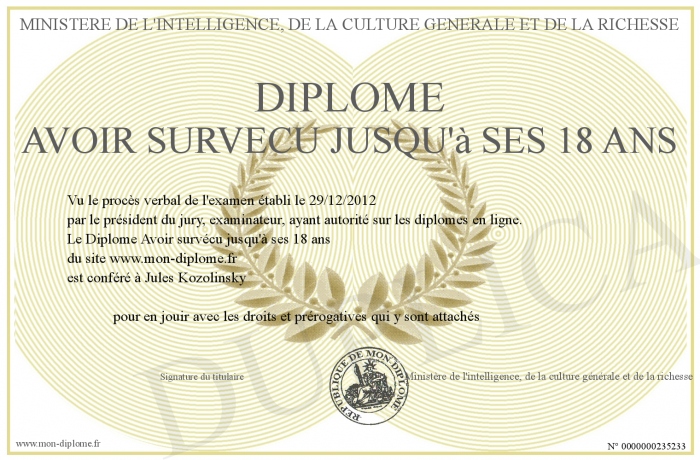 Envoyez par email votre Diplôme Avoir survécu jusqu'à ses 18 ans personalisé