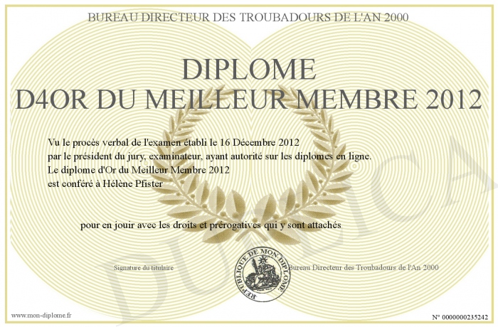Envoyez par email votre Diplôme d4or DU mEILLEUR mEMBRE 2012 personalisé