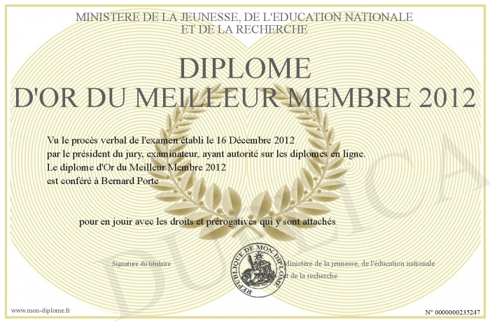 Envoyez par email votre Diplôme d'OR du Meilleur Membre 2012 personalisé