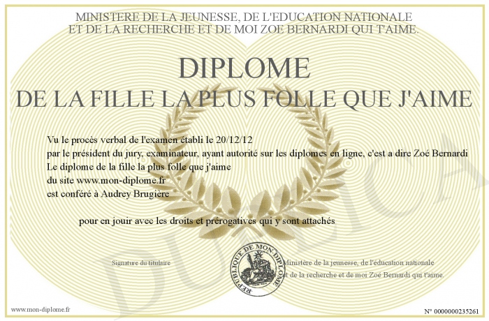 Envoyez par email votre Diplôme de la fille la plus folle que j'aime personalisé