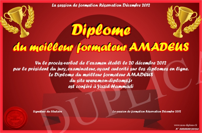 Envoyez par email votre Diplôme du meilleur formateur AMADEUS personalisé