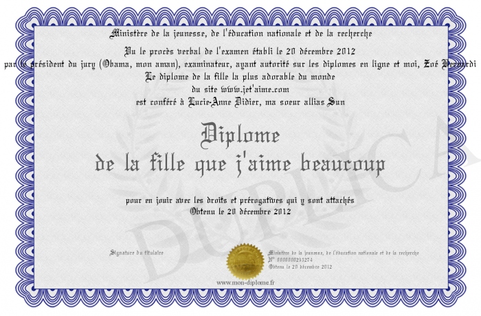 Envoyez par email votre Diplome de la fille que j'aime beaucoup personalisé