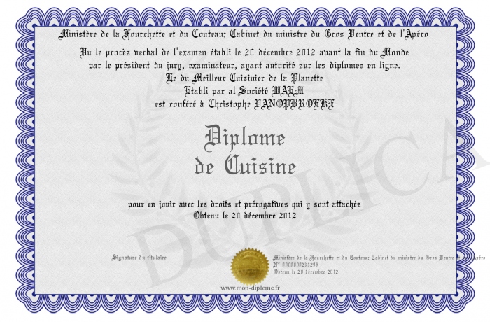 Envoyez par email votre Diplôme de Cuisine personalisé