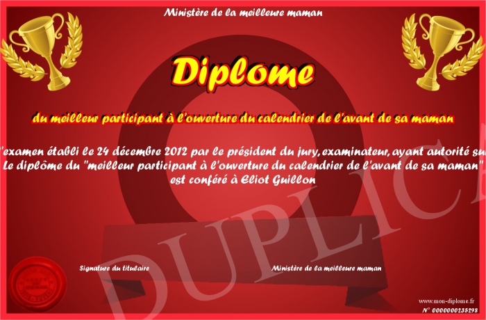 Envoyez par email votre Diplôme du meilleur participant à l'ouverture du calendrier de l'avant de sa maman personalisé