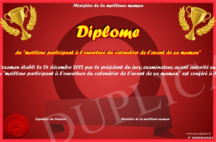 Envoyez par email votre Diplôme du -meilleur participant à l'ouverture du calendrier de l'avant de sa maman- personalisé