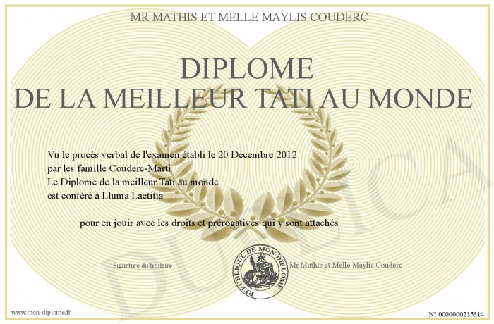 Envoyez par email votre Diplôme de la meilleur Tati au monde personalisé
