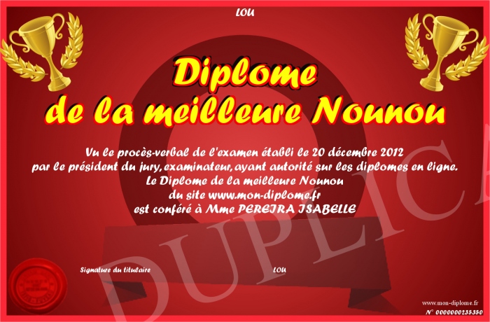 Envoyez par email votre Diplome de la meilleure Nounou personalisé