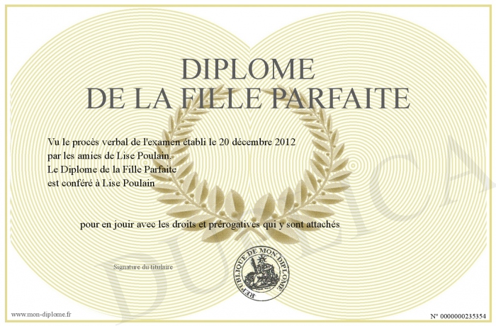 Envoyez par email votre Diplôme de la Fille Parfaite personalisé