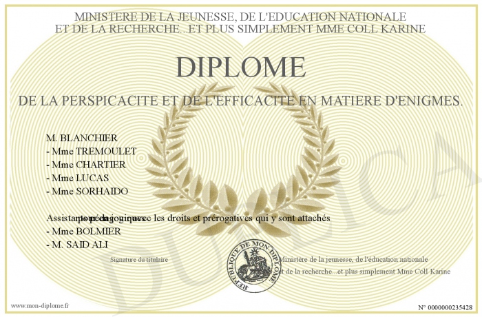 Envoyez par email votre Diplôme de la perspicacité et de l'efficacité en matière d'énigmes. personalisé