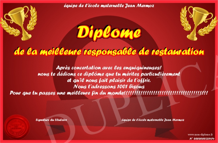 Envoyez par email votre Diplôme de la meilleure responsable de restauration personalisé